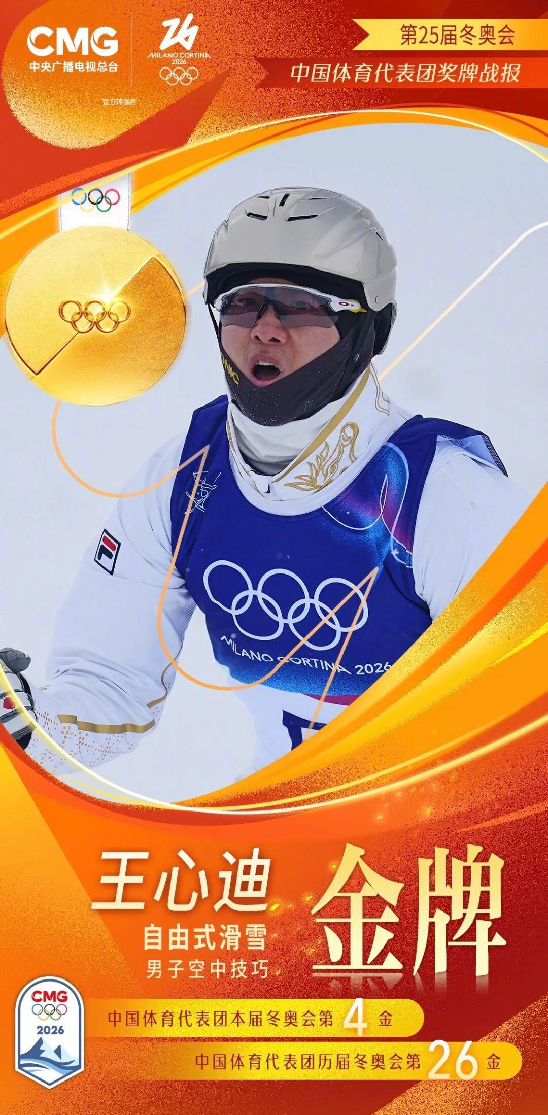 当地时间2026年2月20日,米兰-科尔蒂纳冬奥会自由式滑雪男子空中技巧决赛现场,利维尼奥的风雪见证了一段荣耀时刻。中国选手王心迪纵身跃起,完成难度系数5.1的惊天一跳,以132.60分的高分摘得金牌,为中国队斩获本届冬奥会第四枚金牌。