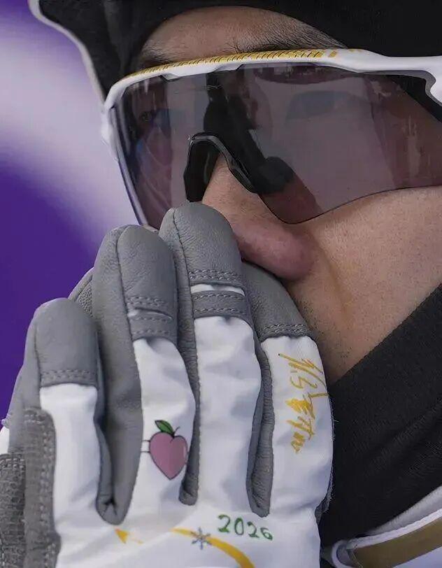 他们的浪漫,藏在赛场的每一个细节里,每一处都令人动容:王心迪的参赛手套上,一只绣着“桃”,一只绣着“心”,把对妻子的爱意,缝进每一次握杖、每一次起跳。