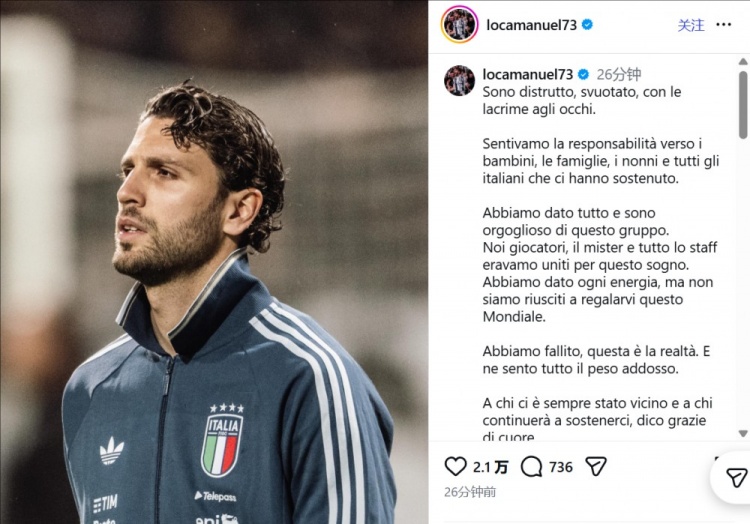 4月2日讯 在意大利无缘世界杯正赛后,意大利国脚洛卡特利更新了社交媒体。